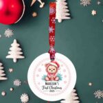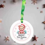 Celebrate a little one’s magical first Christmas with our adorable Pink Bear Acrylic Ornament. Featuring a cute bear illustration and personalised with any name of your choice, this keepsake is finished with the text “First Christmas” and the current year.